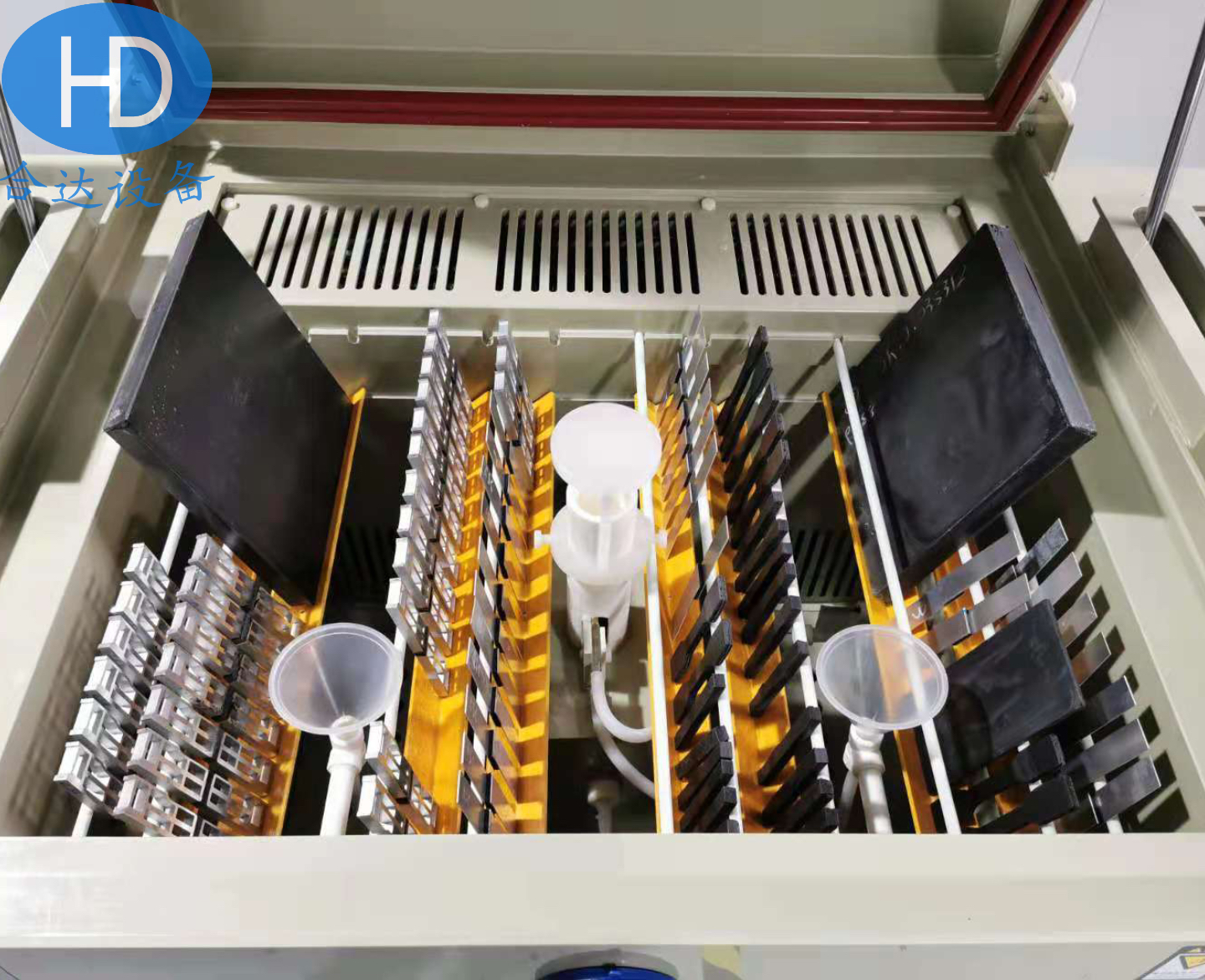 1.3试验室置物架:采用复合树脂纤维精致设计成”V”形长条, 与复合树脂纤维棒直经为14mm的“O”形长条搭配,以确保由被测产品由15°-30°角度随意调整. 试验样品架采用平面分度式,可任意调整角度,四面落雾均匀,受雾完全一致,测试结果准确,试验样品放置数量多。同时采用底部网孔置物平台便于大尺寸样件及异形样件的合理摆放。